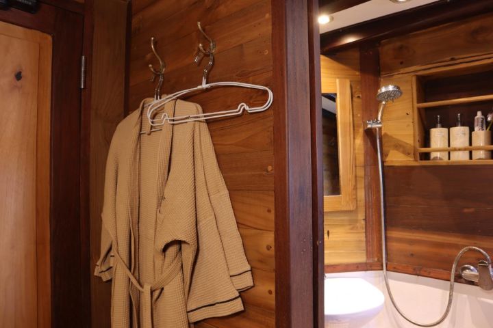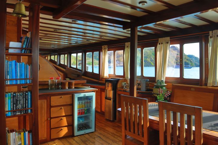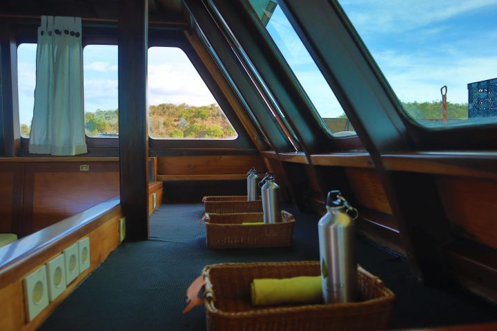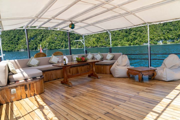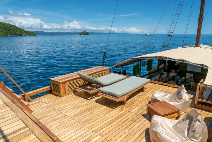 Auf dem Hauptdeck befindet sich ein schattiger Essbereich im Freien mit großem Tisch und Sofas. Die Lounge bietet ausreichend Platz für Mahlzeiten im Innenbereich und eine kleine Bibliothek mit Büchern, darunter Bestimmungsbücher für Fische und Vögel. Auf dem Sonnendeck erwarten Euch gepolsterte Sonnenliegen und auf dem schattigen Aussichtsdeck komfortable Sitzsäcken. An Bord sind außerdem zwei Kajaks und ein Stand-up-Paddleboard verfügbar. Für Kameras steht ein Arbeitsbereich mit Ladestation und Luftpistole zur Verfügung.